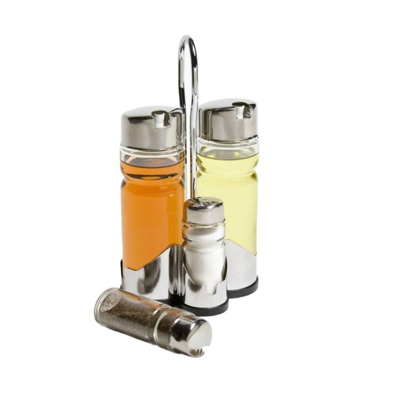 Set de aceitera, vinagrera, salero y pimentero de vidrio con tapa con tapa de acero inoxidable y base organizadora. Packaging con caja decorada.