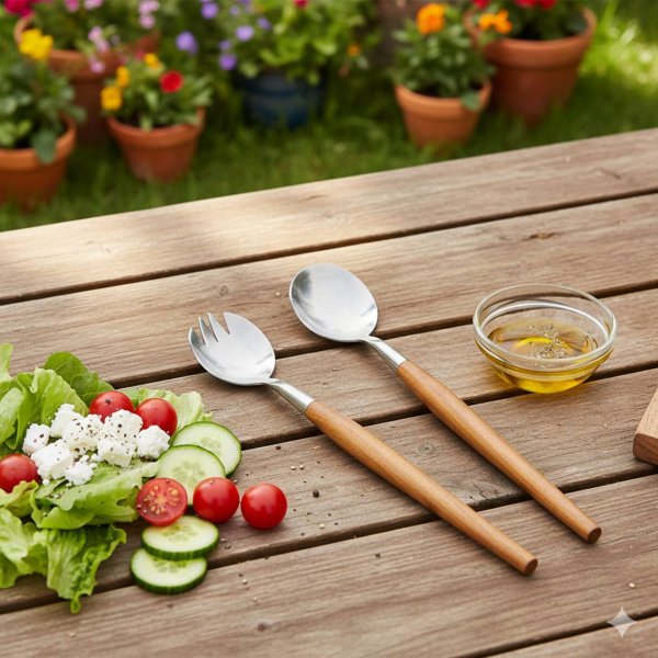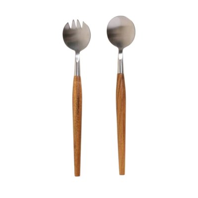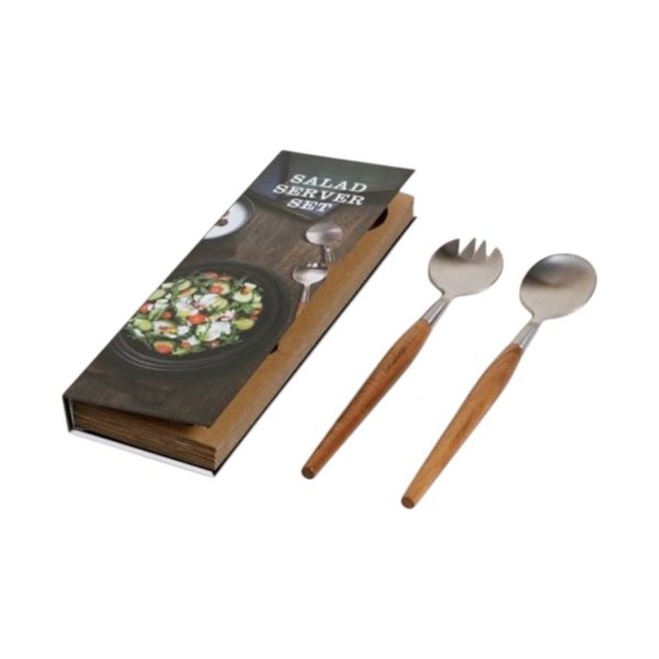 Juego para servir ensalada fabricado en acero inoxidable y madera de acacia. Packaging de regalo.
