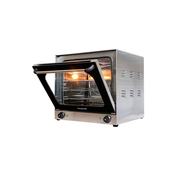Horno convector eléctrico profesional con función de circulación x aire caliente. Puerta con doble vidrio esmaltado y doble forzador. Luz interna y termostato.