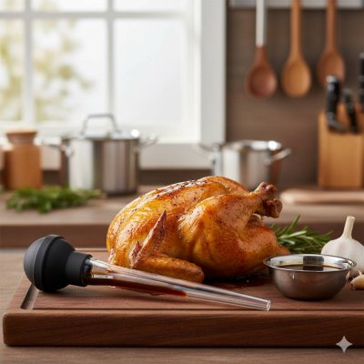 Jeringa para untar fabricado con materiales resistentes y duraderos, es ideal para asados y preparaciones especiales. Aplica marinadas y jugos fácilmente sobre mariscos, aves y carnes al horno. Su bulbo de silicona flexible genera una potente succión para recoger líquidos y distribuirlos de manera uniforme. Ideal para potenciar el sabor y la textura de tus preparaciones.