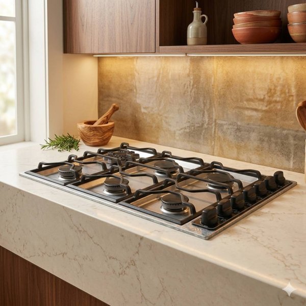 Anafe con 6 hornallas fabricado en acero inoxidable, con rejillas enlozadas. Tiene cinco hornallas redondas y otra estrella