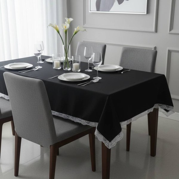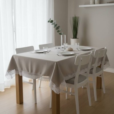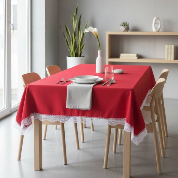 Mantel rectangular fabricado en tela anti mancha lisa con detalles de puntilla