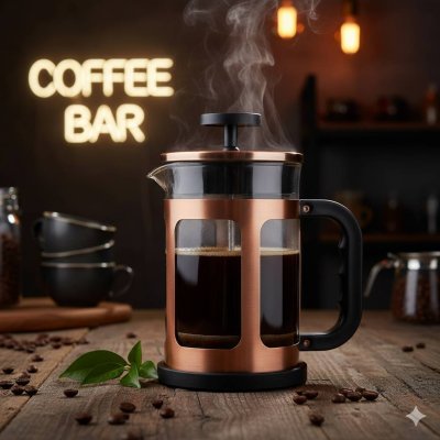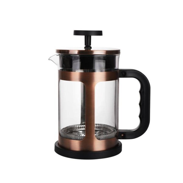Cafetera con émbolo fabricada en vidrio borosilicato, base color cobre y asa de plástico negro