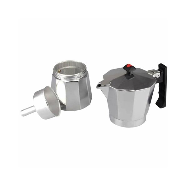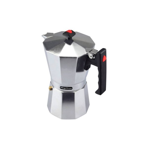 Cafetera manual tipo italiana fabricada en aluminio extra grueso, componente muy ligero, excelente conductor térmico y eléctrico lo que redunda en ahorro de tiempo y energía. El calor se reparte de forma uniforme en toda la superficie. Apta para cocinas eléctricas, gas y vitrocerámica. Tiene mango ergonómico, termorresistente de bakelita que ofrecen un manejo cómodo y seguro de toque frío que se adapta al estilo de cualquier cocina. No apta para inducción.