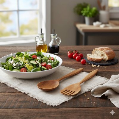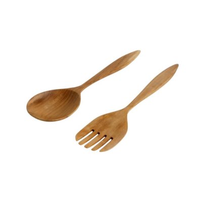 Juego para servir ensalada fabricado en madera de teca. No es apto para lavavajillas.