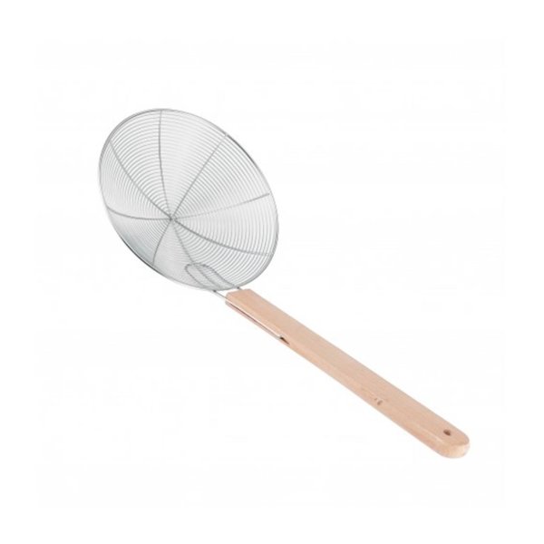 Colador tipo araña fabricado en acero inoxidable con mango de madera.