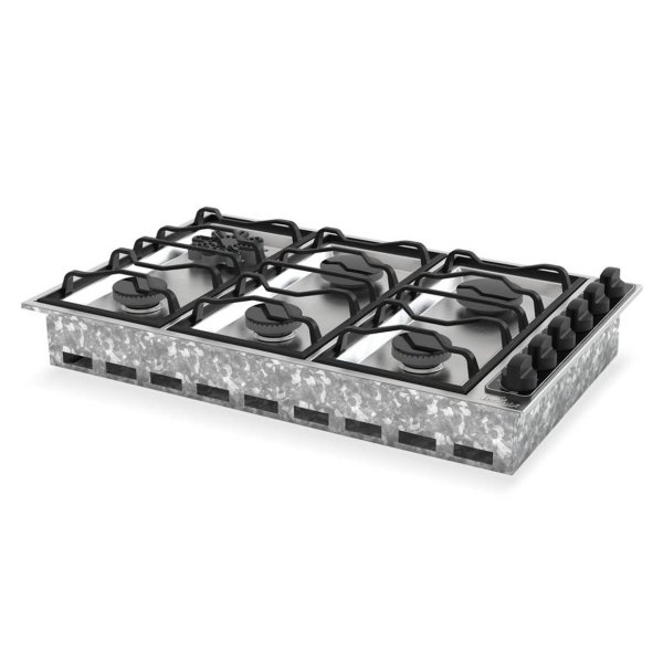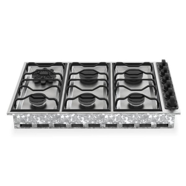 Anafe con 6 hornallas fabricado en acero inoxidable, con rejillas enlozadas. Tiene cinco hornallas redondas y otra estrella