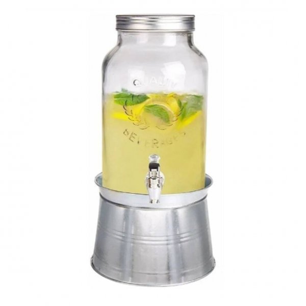 Frasco de vidrio con canilla y base de zinc, ideal a la hora de reuniones, mesas de cumpleaños. Son prácticos a la hora de servir aguas saborizadas, jugos o exprimidos.