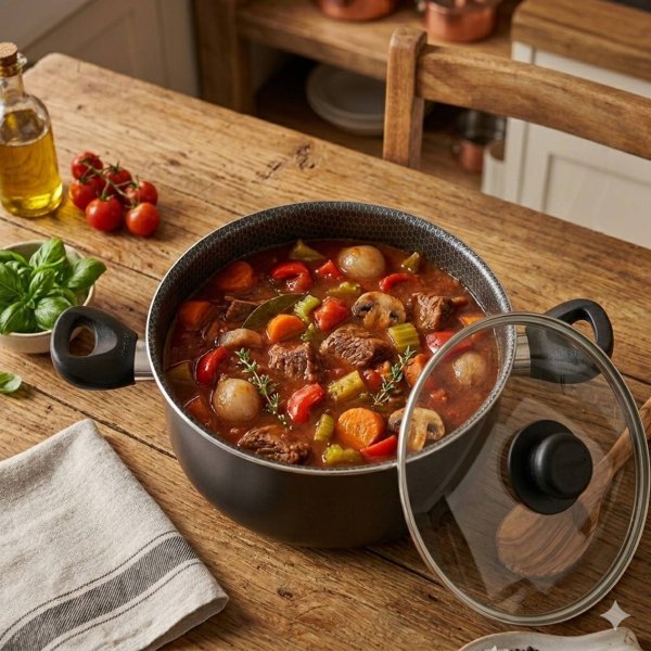 Cacerola línea GOURMET, fabricada en aluminio recubierta en antiadherente y con tapa de vidrio